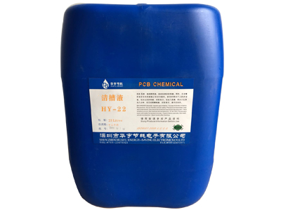 碱性清槽液HY-22 是印制电路板专用的显影槽清槽液,针对干膜、防焊制程,因槽内、管路、喷嘴残留的固体沉淀物及油性物质,会造成显影不良或破坏设备、降低设备使用寿命,碱性清槽液针对此不良而研发,能有效的清洁槽体。定期清槽可有效的确保生产质量和延长设备的使用寿命,其独特的单液型配方可节省作业时间,提高生产效率。